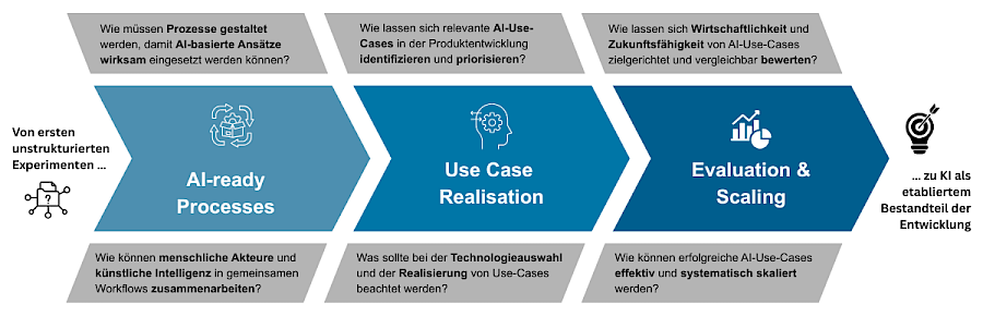 The framework serves to structure the subject matter and facilitate a focused discussion within the project. This consortium study covers issues relating to the processes in which AI can be integrated, the implementation of individual use cases, and the subsequent evaluation and scaling of such projects. These thematic areas provide an overview of the relevant issues but do not constitute a final selection. At the kick-off meeting, the consortium partners will have the opportunity to set priorities and focus on specific issues. Individual questions raised by the consortium partners will also be allocated to the relevant thematic areas at this stage.